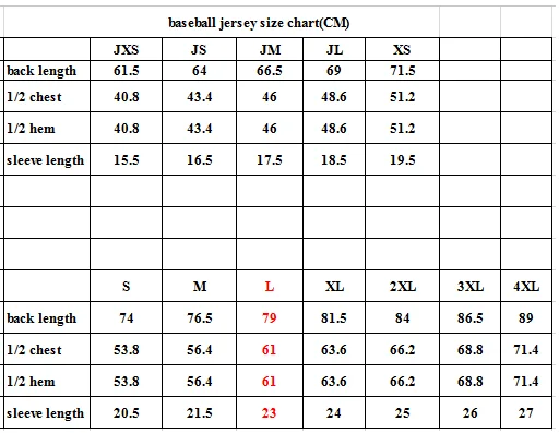 Size chart for baseball jersey :