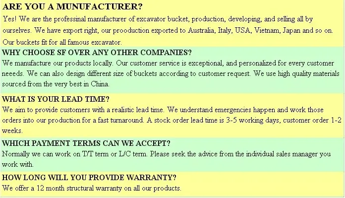 SF buckets have our own factory and all of buckets are designed,made and sold by ourselves.SF buckets have the ISO-9001-2008 certification and SGS.We can supply our products with high quality and we are your trusted excavator bucket manufacturer.