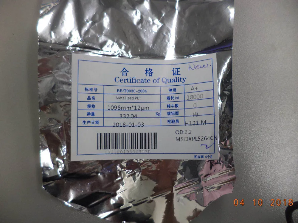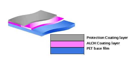 One side vacuum ALOX on corona treated side of plain BOPET film, designed as a high barrier purpose .