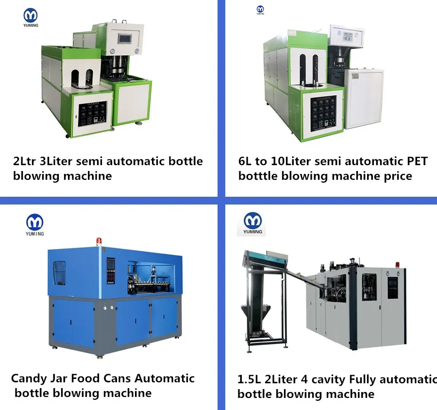 YM-A series blowing machine need manual feeding,but automatic blow bottle,automatic take bottle.Worker can operate it very easy,and don’t need traning.This type blowing machine can below 20L PET bottle.
