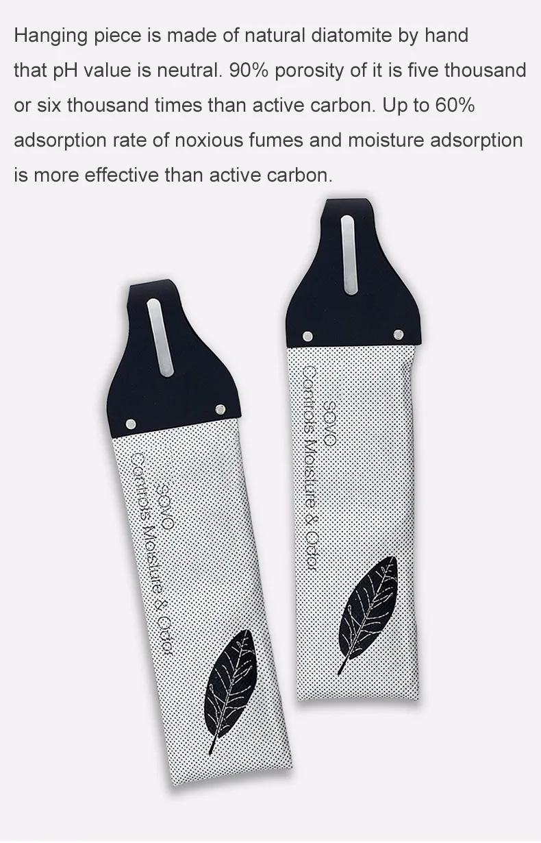 3. Amount of pores of diatomite are several thousand times than bamboo charcoal. As a result, absorption odor and moisture effect of our diatomite hanging piece is far superior to bamboo charcoal bag.