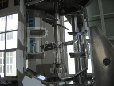 Materials in the homogeneous pot by stirring the pot on the Teflon scraper (scraper always meet the pot body, sweeping the wall sticky material), continue to produce a new interface, and then through the blender shear, compression, folding, So that it is stirred, mixed and down to the homogenizer below the pot body, and then through the high-speed rotation of the rotor and the stator produced between the strong shear, impact, turbulence and other processes in the shear material is cut , Quickly broken into 200nm ~ 2μm particles. Material particles, emulsification, mixing, mix thoroughly, dispersed, etc. can be completed in a short time. As the homogeneous pot is in a vacuum state, the bubbles generated during the mixing process are promptly removed. After the homogenization finish, the material inside could be discharged by titling the pot by handwheel aside.
