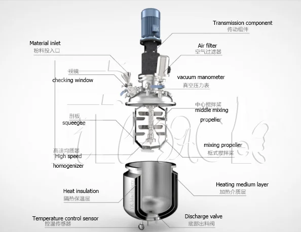 The material of the pot body (including interlayer), the lid of the pot, the stirring shaft, the agitator, the emulsification axis and the emulsification homogenizer are SUS304 high quality stainless steel.