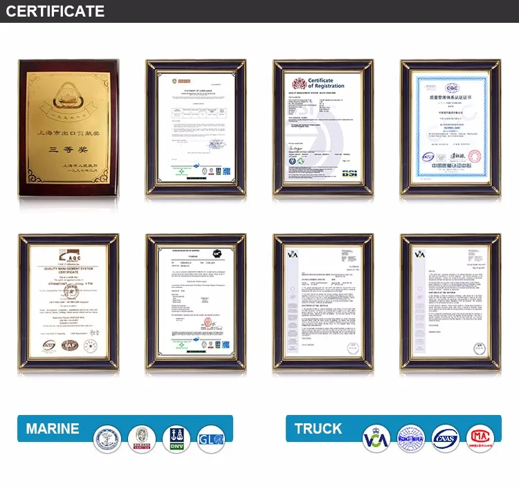 Sinotruk marine engine devided into for series, that is WD615, WD415, WD615.57, and D12 series for main power engines and auxiliaries. 1. Main power engines are devided into two categories, basic use and fishing boat use with speed 1500r/min,1800r/min,2100r/min(or 2000r/min). The basic includes turbocharged intercooled engine model and turbocharged model, and the turbocharged intercooled models are the same as truck engines, but adding marine special spares, such as marine intercooler, sea-fresh water heat-exchanger, monitor, PS8500 fuel injection pump(with parking electromagnet),sea water pump, SAE1# flywheel case, 14'flywheel, and flywheel connecting flange, supporter, the installment size is 740*1089.2(and for WD415 series is 740*789.2), the distance from crankshaft center height is 135. The fishing boat used engines based on the basic used have been changed into 4 slots fishing pulley, connecting flange(M14*1.5), diesle filter installed in the air-intake pipe and also add diesle pre-filter installed in the air-intake pipe, the installing size is 694*1145.5*140mm( for WD415series is 694*805.5*140mm). Main power engines can choose 6135flywheel case, when replace with SAE1 flywheel case, please change the flywheel case and connecting flange.