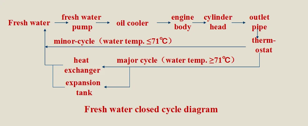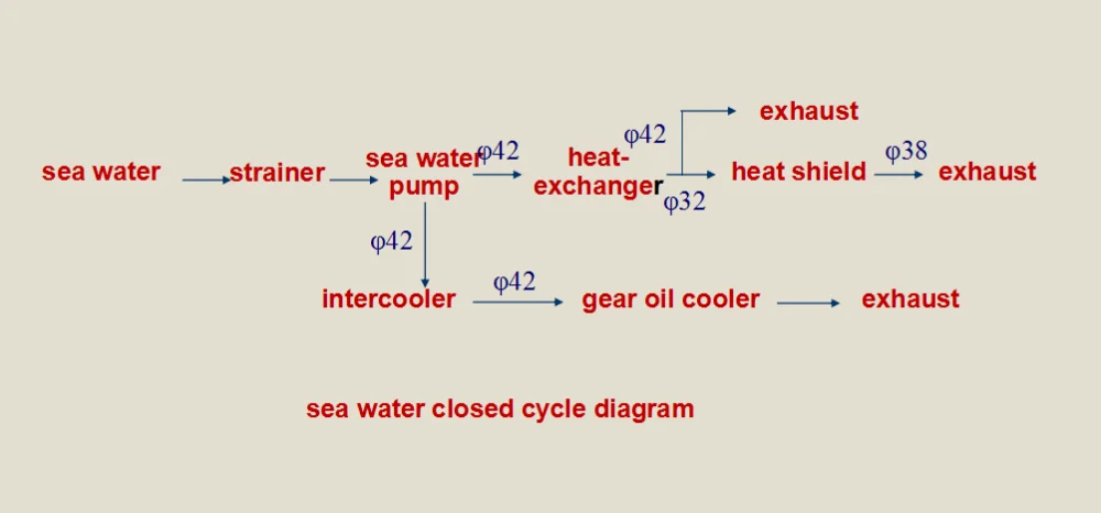 The Centrifugal pump fixed in front cylinder block time gear room, water pump scrollhousing and outlet and time gear roomcasting into a block. Water pump pulley of crankshaft is driven by two V-belt. Marine diesel engine adopting fresh and sea water double-cycle cooling system, and fresh water is the closed cycle, sea water is open cycle. It mainly consists of fresh water pumps, sea water pump, heat exchanger etc. Such engine uses the recessed oil cooler, through the cooling water system for oil cooling.