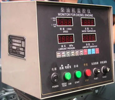 Marine engine general instrument includes main monitor controller and remote controller with 45m remote transmission line, showing cabin and driving room start and stop, and showing speed, water temp., oil temp., oil pressure etc. Abnormal alarm is realizable for higher temp., overspeed and lower oil pressure, for stopping is operationable.