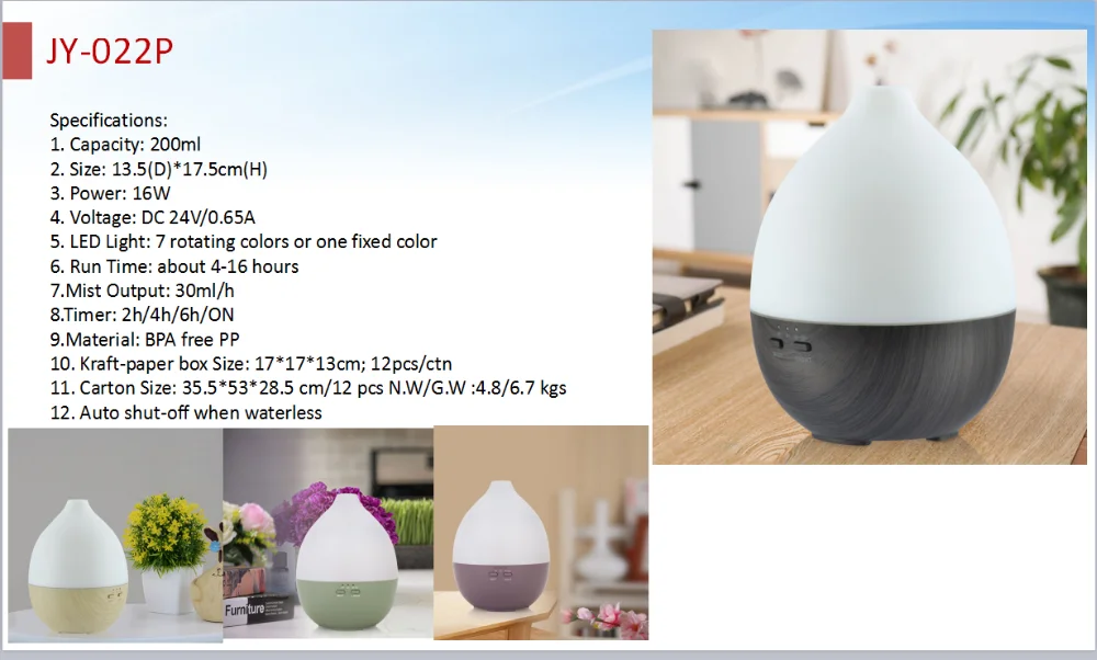 This aroma diffuser is equipped with a fan at the bottom, to facilitate cooling, protection devices.Diffuser coated with wood grain, which makes it look very natural and primitive. With compact and portable design, the cap of the aroma diffuser is easy to take off, you won't bother to unscrew the cap with great force when your hands is wet. Just gently take off the cap, add water and essential oil, enjoy high-quality life.