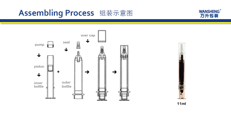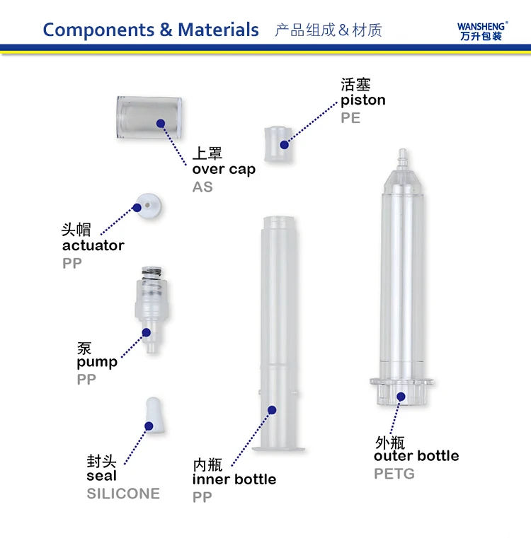| Meterial: | over cap:AS seal:SILICONE pump:PP piston:PE inner bottle:PP outer bottle:PETG | ||||