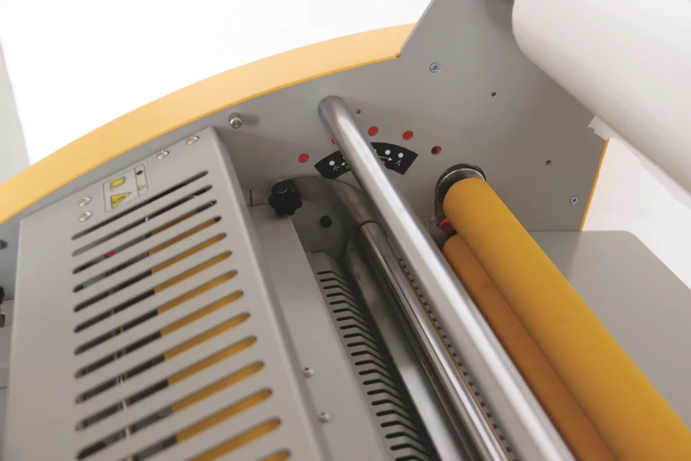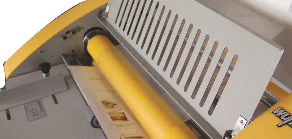 A heated roll laminator uses heated rollers to melt glue extruded onto lamination film. This film is in turn applied to a substrate such as paper or card using pressure rollers. The primary purpose of laminating with such a machine is to embellish or protect printed documents or images. Heated roll laminators can vary in size from office based pouch laminators to industrial sized machines. Such industrial machines are primarily used for high quantity/quality output by printers or print finishers.