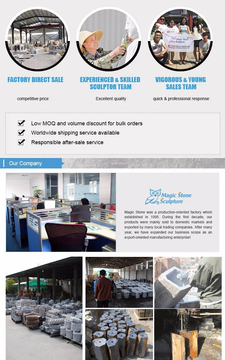 Magic Stone owns two factories which are located in Quanzhou city. Besides, we cooperate with another three factories in North of China, to provide wide range of stone sculptures for clients, thus competitive price and high standard quality can be ensured. Magic Stone are especially professional in produce stone garden birdbath, animal ornaments, water fountains, basalt garden landscapes, etc.