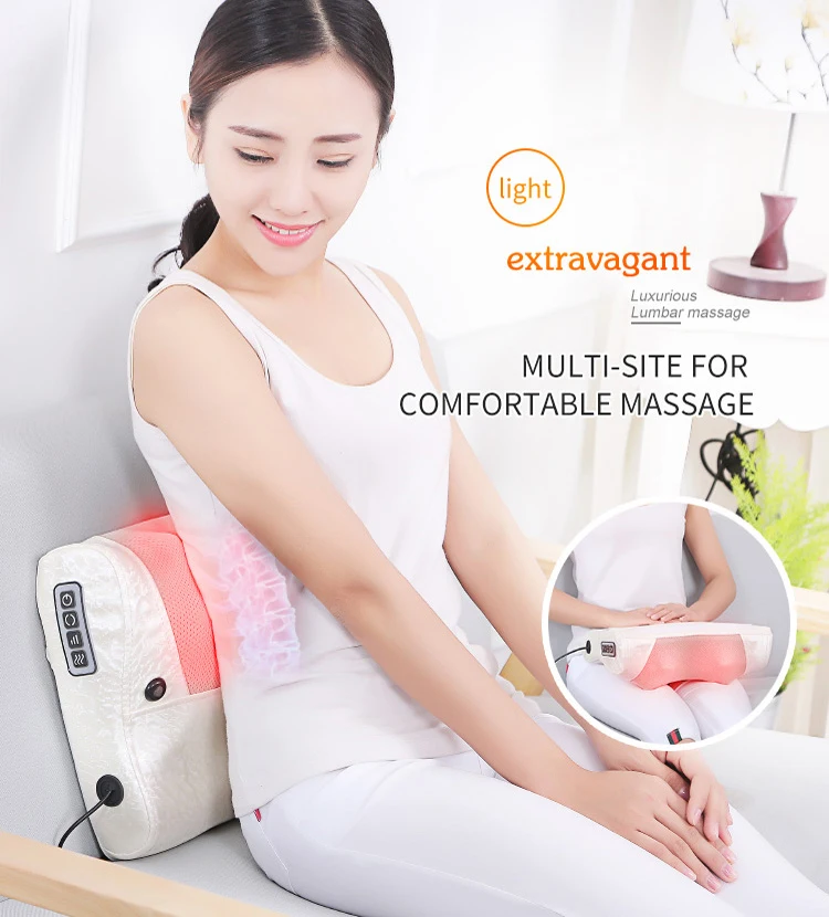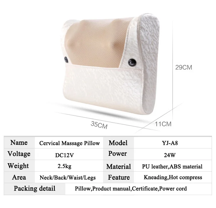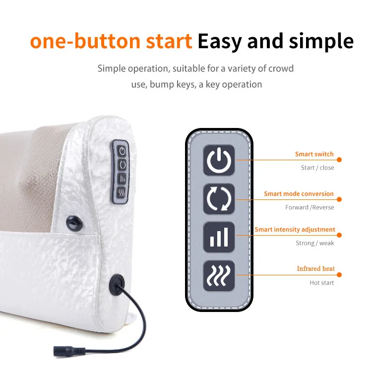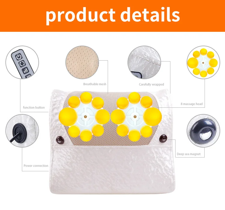 The product is designed of simulation kneading massage experience, can massage to many body parts, and can be used when lying, sitting or leaning. It has 16 massage heads inside. The massage heads have warm adjustment. There are two magnets for physiotherapy massage. The massager is 12V low voltage designed, control keys are convenient and simple. It is one key started, 15 minutes automatic time set, has positive and reverse modes. The power has three gear selections. It is the preferred gift for your friends.