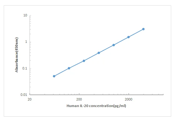 Mature human and mouse IL-20 is a 152 amino acid protein that is not likely glycosylated. Although IL-20 is a distant member of the IL-10 family, it functions as a monomer. IL-20 binds two heterodimeric receptor complexes, IL-20 R alpha/IL-20 R beta and IL-22 R/IL-20 R beta. IL-20 is reported to induce the proliferation of multipotential hematopoietic progenitor cells, direct the differentiation and expansion of keratinocytes, and promote the release of proinflammatory mediators in keratinocytes and other IL-20 receptor-expressing cells.