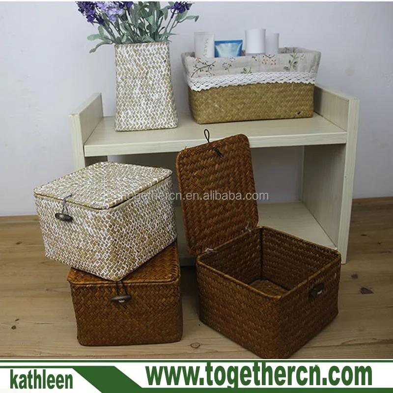 Large Rectangular Handwoven Natural Seagrass Wicker Nesting Storage Baskets and Home Organizer Bins with lid