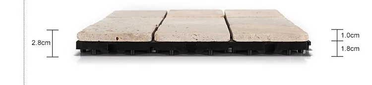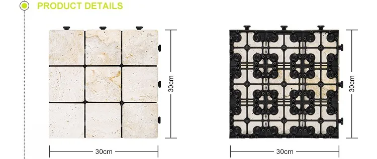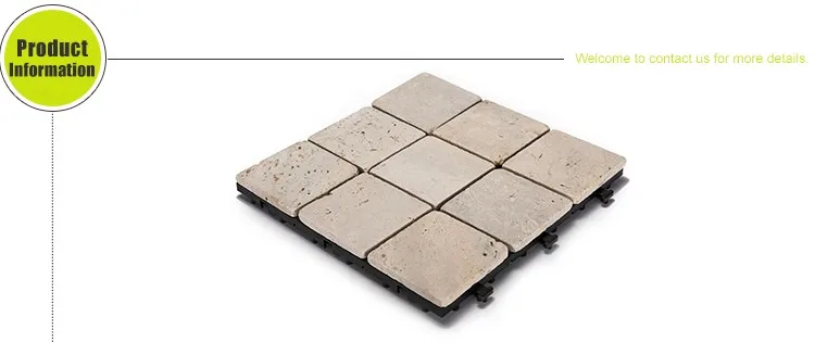 Travertine stone deck tiles, also called interlocking tiles, are creative building materials generated from traditional floor tiles. Each travertine stone deck tile has a plastic base under various natural stone, quick install by a simple click clack action. No tools, no adhesive, no skills needed.