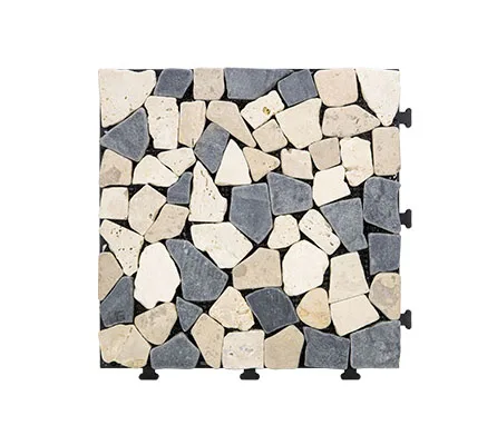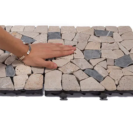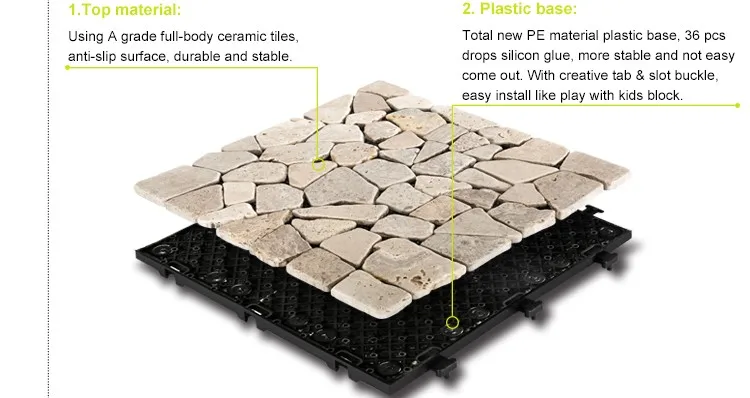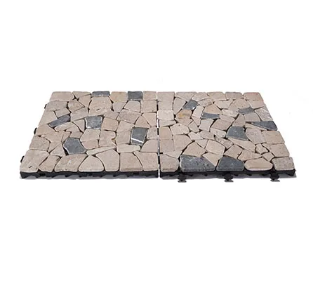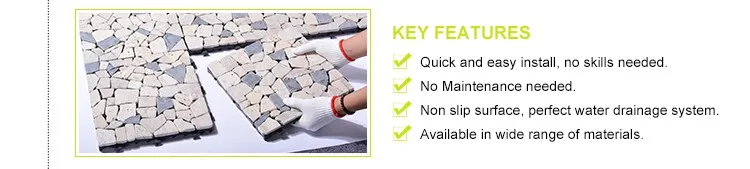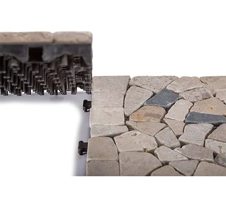 Stone deck tiles, also called interlocking tiles, are creative building materials generated from traditional floor tiles. Each stone deck tile has a plastic base under various natural stone, quick install by a simple click clack action. No tools, no adhesive, no skills needed.