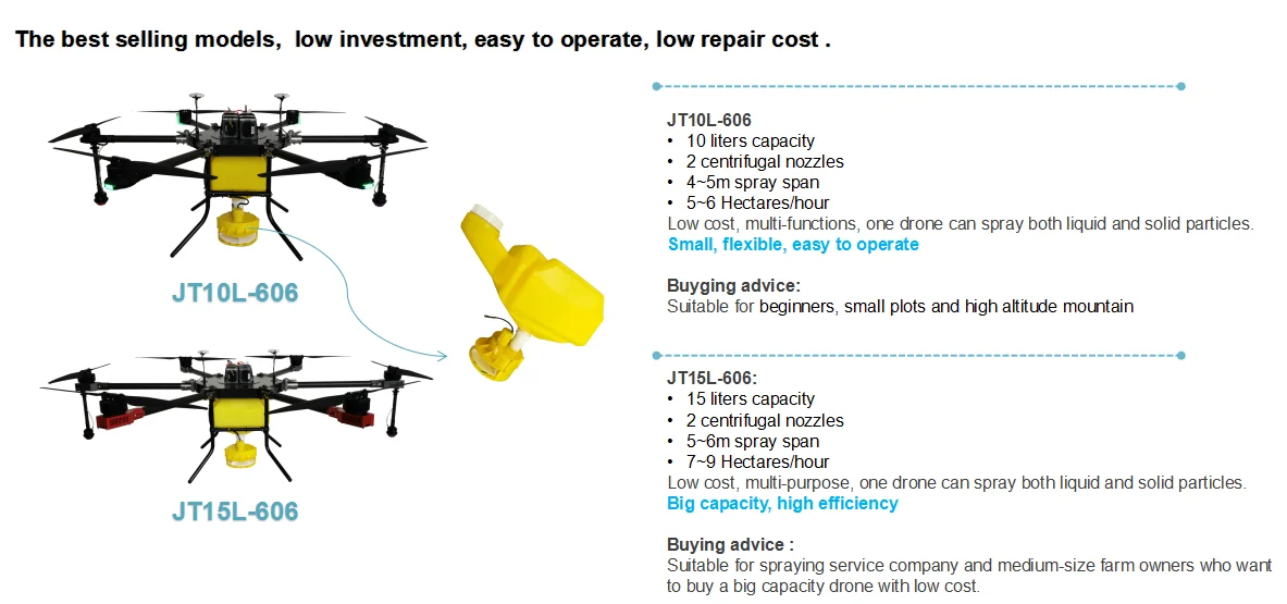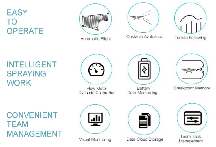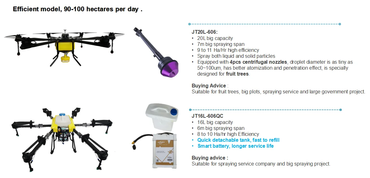 Spraying efficiency | 5-6 Hectares/hour | 7-8 Hectares/hour | 8~10 Hectares/hour | 9~11 hectares/hour |