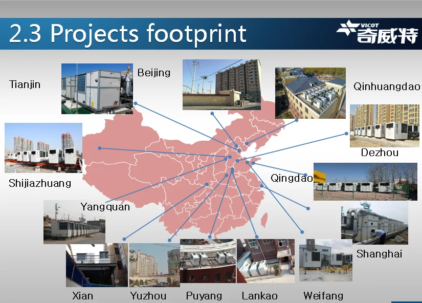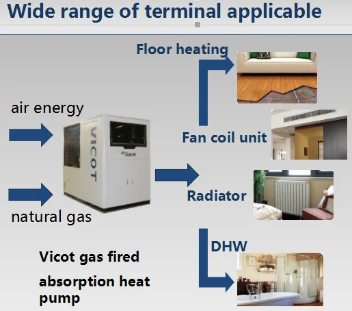 Vicot gas absorption heat pump, referred as GHP, using clean energy-natural gas as the driven energy, MR717 as refrigerant, water as absorbent, extract the low grade heat energy from the air through in heat exchanger; It is a highly efficient energy system in general utilization, which is capable of 1.8 times in heating efficiency.