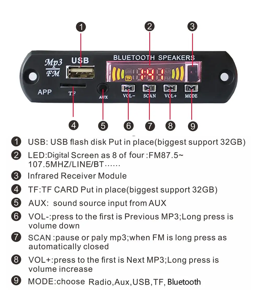 | Main Function | Bt FM USB TF AUX Remote |