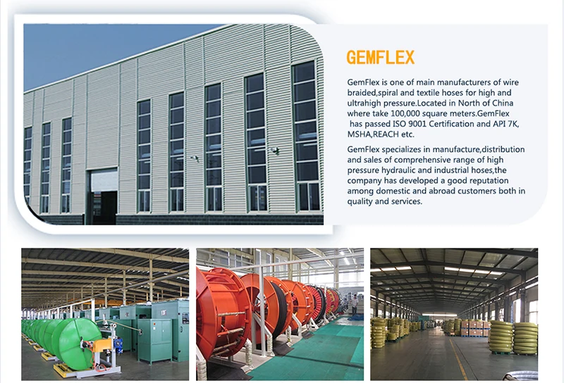 Gemflex - is one of main manufacturers of wire braided,spiral and textile hoses for high and ultrahigh pressure.Located in North of China where take 100,000 square meters.Gemflex has passed ISO 9001 Certification and API 7K,MSHA,REACH etc.