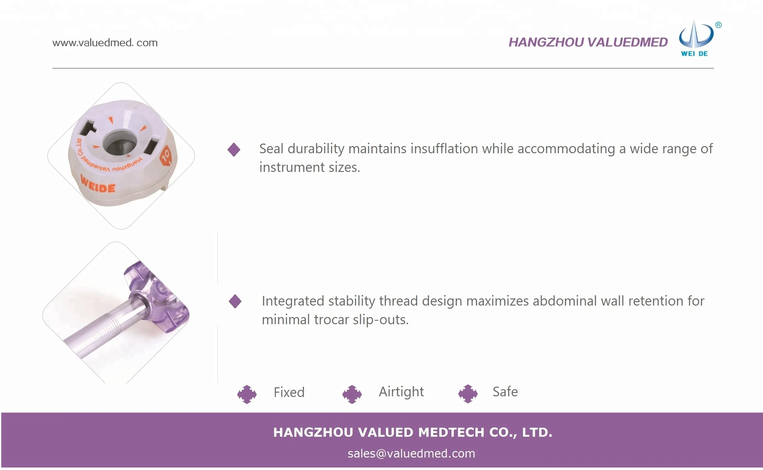 WEI DE® (ValuedMed) Sterile Disposable Laparoscopic Trocar has applications in thoracic, urologic, gynecologic laparoscopy and other abdominal procedures to establish a path of entry for endoscopic instruments. It helps to provide patient less post-operative pain, fewer wound complications, and faster recovery time.