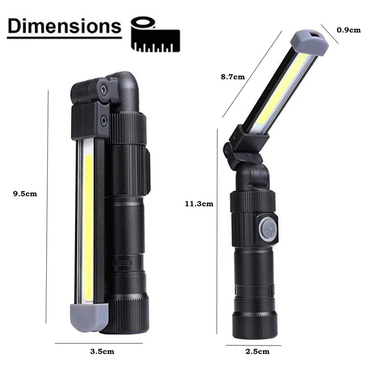 1).COB LED work light & LED light (Top LED offers an additional flashlight function) foldable and 360° Rotatable with no dead angle.