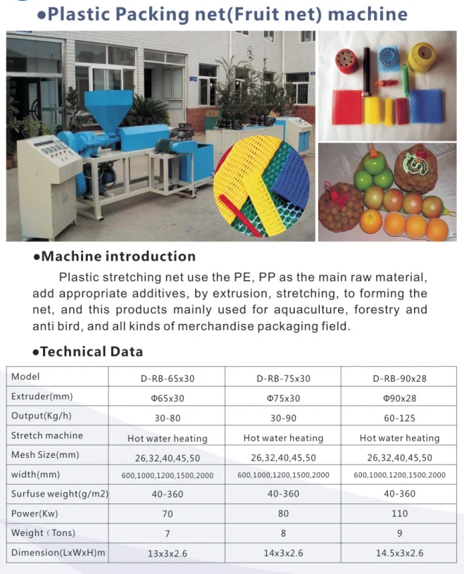Packaging net can be used for packaging of rose, garlic, vegetable, fruit, marine lives and native products, as well as in the field of marine lives breeding. It can also be produced into bath puff.