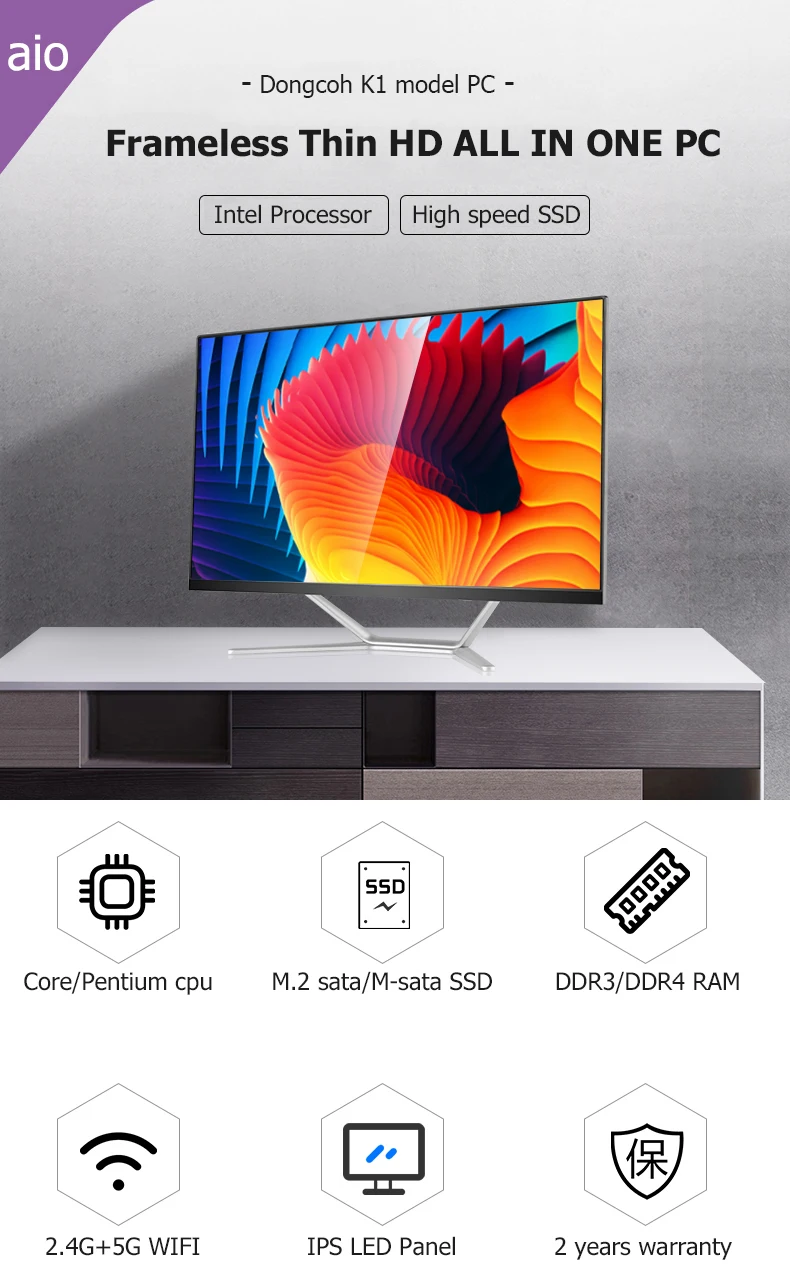 All in one pc: 21.5inch and 23.8inch all in one pc intel i3, i5, i7 from 2nd gen to 8th gen, it can install latest H310 motherboard, DDR4 RAM and M.2 SATA SSD.