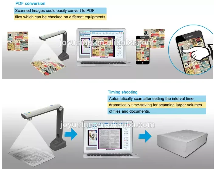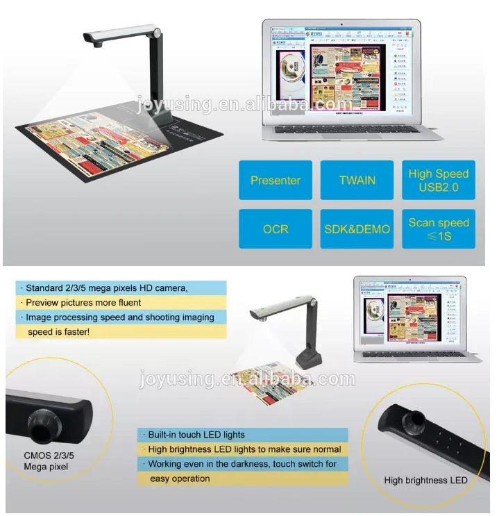 The document camera should be connected with laptop by USB cable and work with software. far more portable and convenient than traditional scanner.