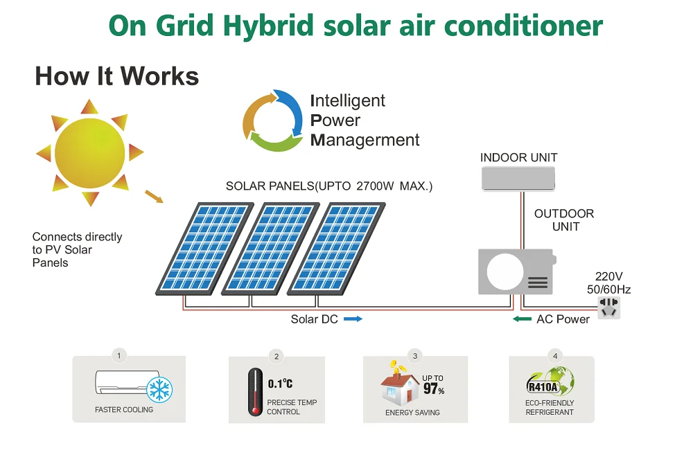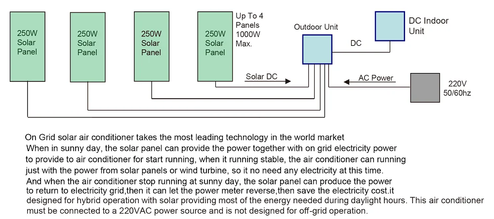 RE:Dual power On Grid Hybrid Solar Air Conditioning system,the power form solar panel priority supply directly to indoor & outdoor fan motor and compressor. When the solar power is not sufficient,by equipped with dual PV MPPT tracking system,the system automatically switch to run by grid power,