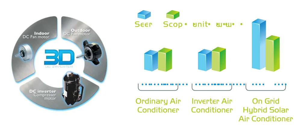 Dual power On Grid Hybrid Solar Air Conditioning system,the power form solar panel priority supply directly to indoor & outdoor fan motor and compressor. When the solar power is not sufficient,by equipped with dual PV MPPT tracking system,the system automatically switch to run by grid power, thus achieved the AC/DC power supply interaction, and uninterrupted supply power to air conditioner, ensure the system high efficiency up to SEER 36;