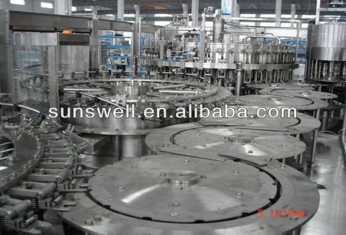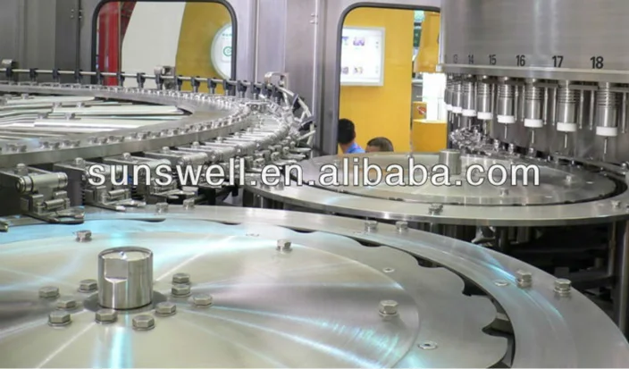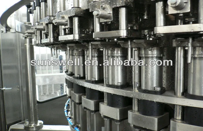 Carbonated drinks filling machine is rotary washing machine, which mainly use for beverage such as mineral water or carbonated drink, new bottle enter the equipment by star wheel, through clip and overturn mechanism make bottle down, after washing, it overturn bottle up automatically, then convey to the filling part by star steel, the main material and washing clip is stainless steel .