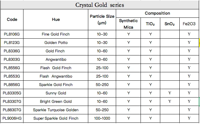 Below is our Crystal Gold series details .We also supply Crystal Silver white series,Crystal Gold series, Crystal series, Crystal Interference series and also other natural mica basing pigments in other pages , welcome to enquiry!