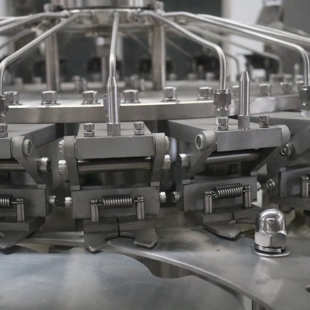 The rotary rinsing turret consists of individual bottle neck grippers and spray nozzles to rinse the inside of PET bottles. All contact parts are made of stainless steel or food grade plastic material. The bottle grabbers take the bottles from the inlet starwheel guaranteeing a secure grip. The bottle is turned upside down and centered above a spraying nozzle that directs a stream of rinse water into the bottle. After being rinsed, the bottle is automatically turned over to an upright position.