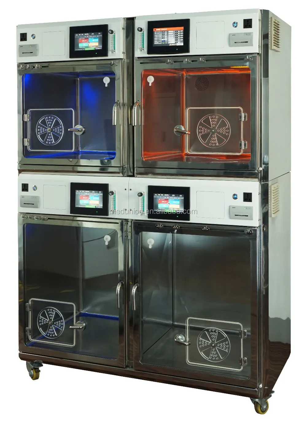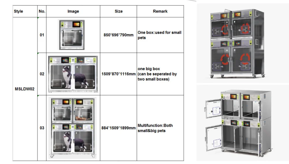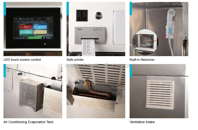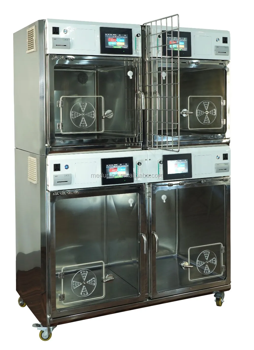 7. Additional more function: divider in bottom large size; multifunctional shelf between two middle cage; hooks, nebulizer, oxygen flow meter, built-in printer, emergency power supply for on every cage. All the components are isolated for easy maintenance.