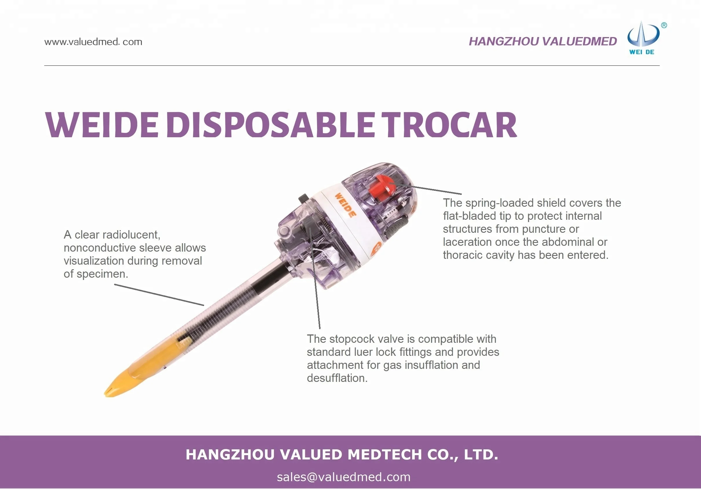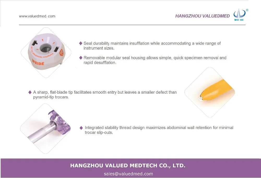 WEI DE® (ValuedMed) Sterile Disposable Laparoscopic Trocar has applications in thoracic, urologic, gynecologic laparoscopy and other abdominal procedures to establish a path of entry for endoscopic instruments. It helps to provide patient less post-operative pain, fewer wound complications, and faster recovery time.