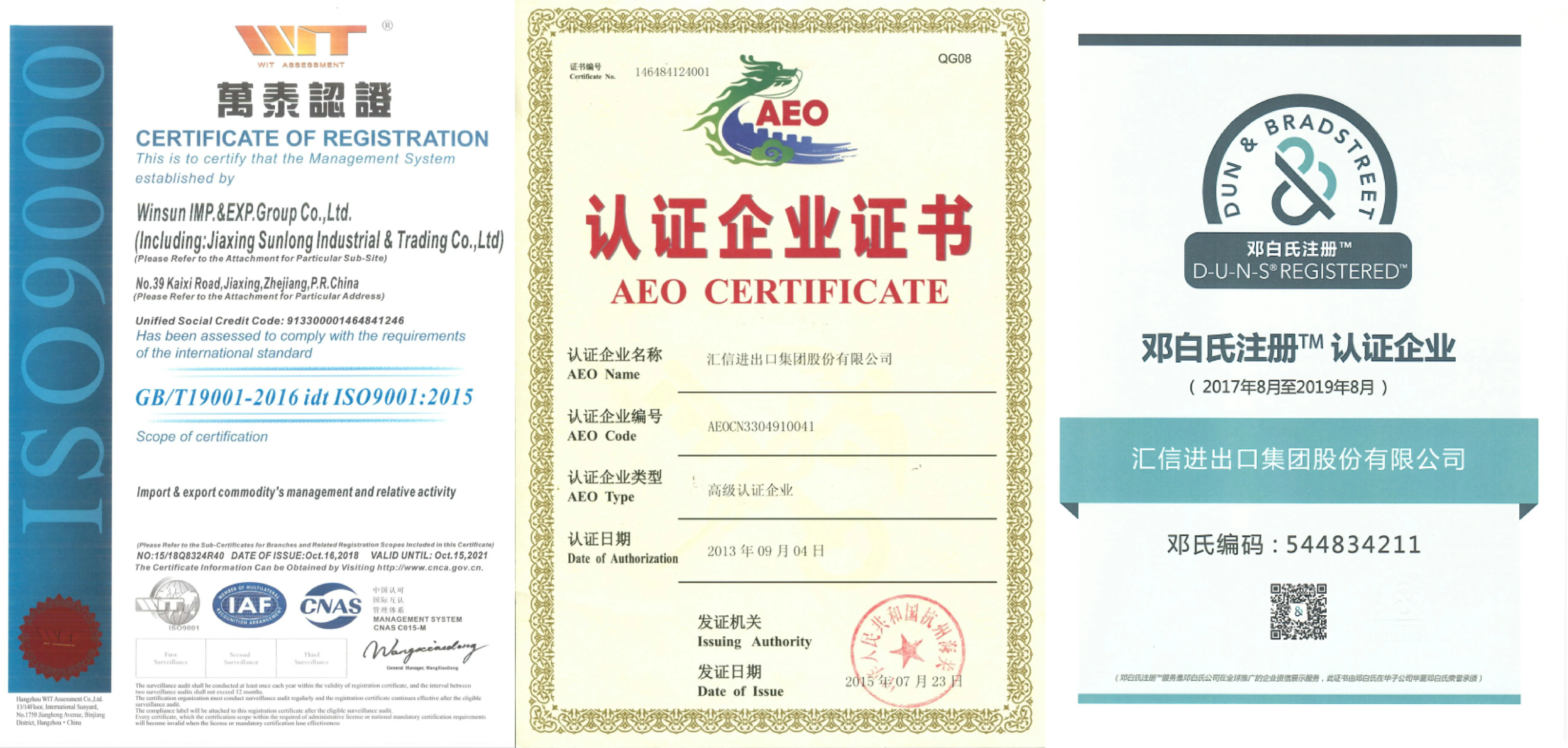 Winsun has been assesed to comply with the requirement GB/T 19001-2008 idt IS09001: 2008 and AEO,