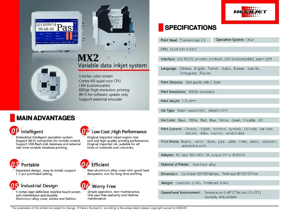 MX2 Variable Data Inkjet Printer Printing System is a new kind of machine with 7 inch 1080P high definition display screen and high precision capacitive touch sreen. It can support bluetooth 4.0/ Wi-Fi connection, system firmware can be upgraded remotely. It can print deformable bar code/ QR code/ text. It can 1-4 plug-and-play spray nozzles at the same time.