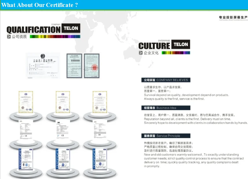 TELON PROJECTION TECHNOLOGY CO,LTD was founded in Hong Kong in 2000, SHENZHEN TELON AUDIO VISUAL EQUIPMENT CO,LTD is her totally invested factory in Shenzhen ,China. TELON Projection Technology Company is an integrative high-tech enterprise which collects research, development, produce and selling, was established in 2000, located in Shenzhen, specializing in the manufacture of projection screen, projector, interactive white board and other projection related products.
