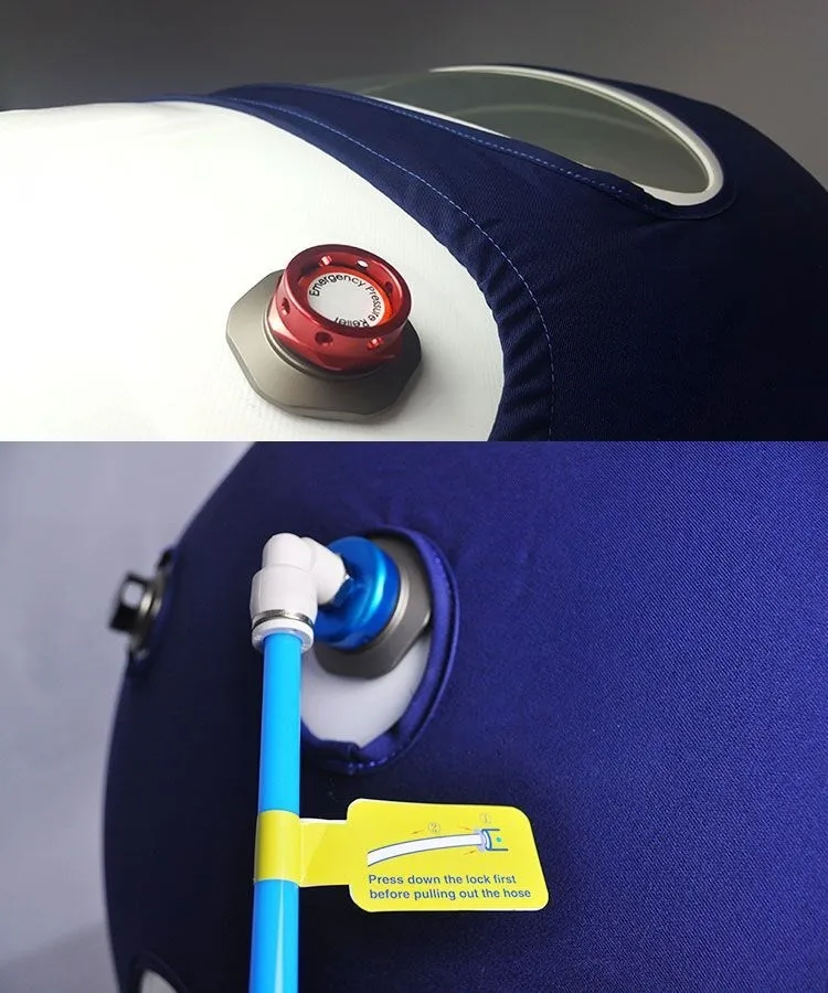Two automatic pressure relief valves at the tail of the chamber have protection against false controls, keeping constant air circulation within the hyperbaric oxygen chamber.Unique emergency pressure relief valve speeds the depressurization which enable patients to get out of the chamber quickly.