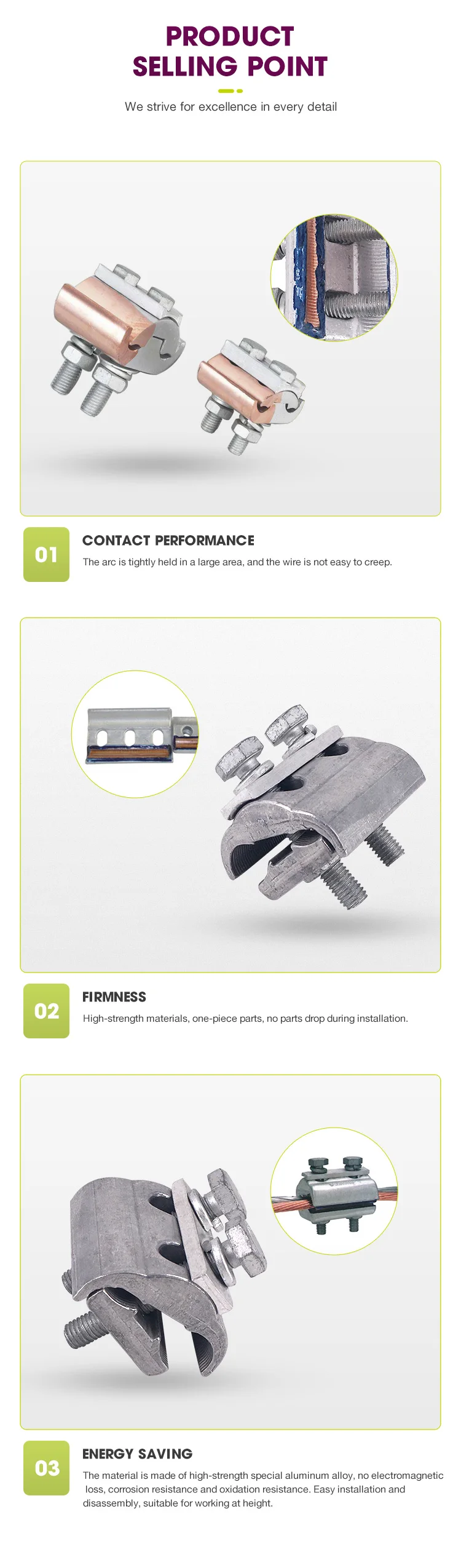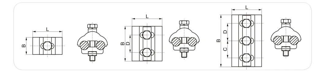 Structural Features | 1.Choosing the high strength, corrosion resistant aluminium alloy and forging bimetal. 2.Tooth type, small contact resistance, reliable connection. 3.Siamesed parts, will not fall any part during assembly. 4.Hold a large area of arc, the contact surface will be closer which will improve the grip strength between clamps and conductors. |
