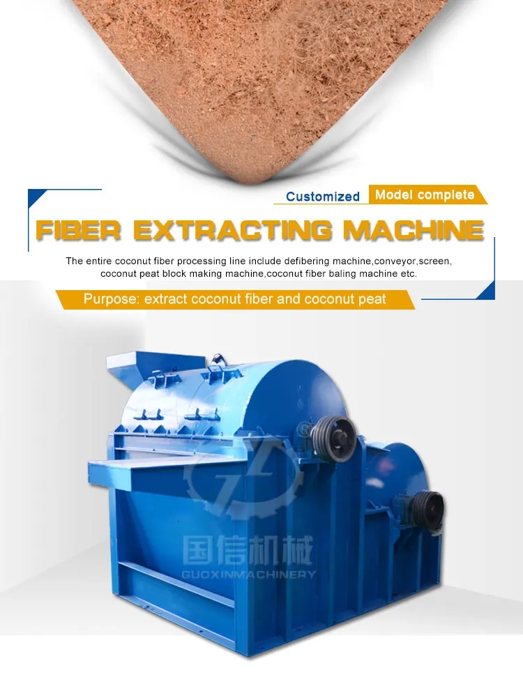 The coconut coir fiber extracting machine is mainly used for loosing and rubbing,kneading the hard facial fiber of oil palm, palm, coconut shells,jute,bamboo etc. The final product shape through extracting machine is wirelike. The wirelike fiber has a very potential and large market in Chinese and foreign countries. It is the original material of mattress,insole,seat cushion,etc.