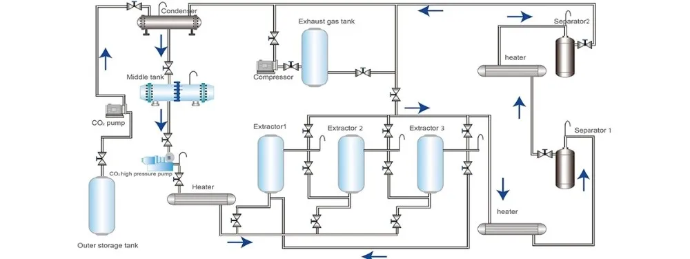 Supercritical fluid CO₂ technology is a new and clean isolation technology, which exploits the special dissolving capacity of CO₂ and target substance under supercritical condition by controlling CO₂ pressure, temperature, etc., to dissolve and isolate target substance. Compared with other traditional processes, it shows incomparable advantages, such as, using inert gas as solvent, cheap and easily accessible; pollution-free and environment-friendly; simple process; no residue of chemical solvent in target substance which guarantees the quality of target product.