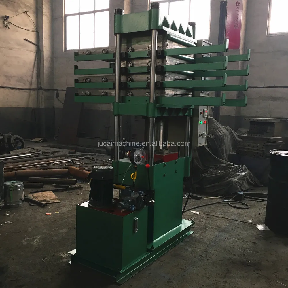 This machine is used to heat , vulcanize and solidify the rubber compound from mixer machine to be 1000*1000mm rubber tiles .This machine needs totally 2 set molds . One set molds includes one top mold and two bottom mold . As showed in picture , the machine is equipped with 2 set automatic type adjustable rail device , which is used to push mold in and out for easy operation