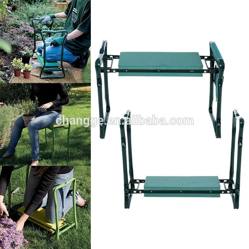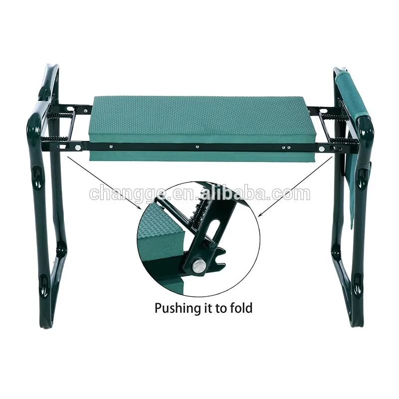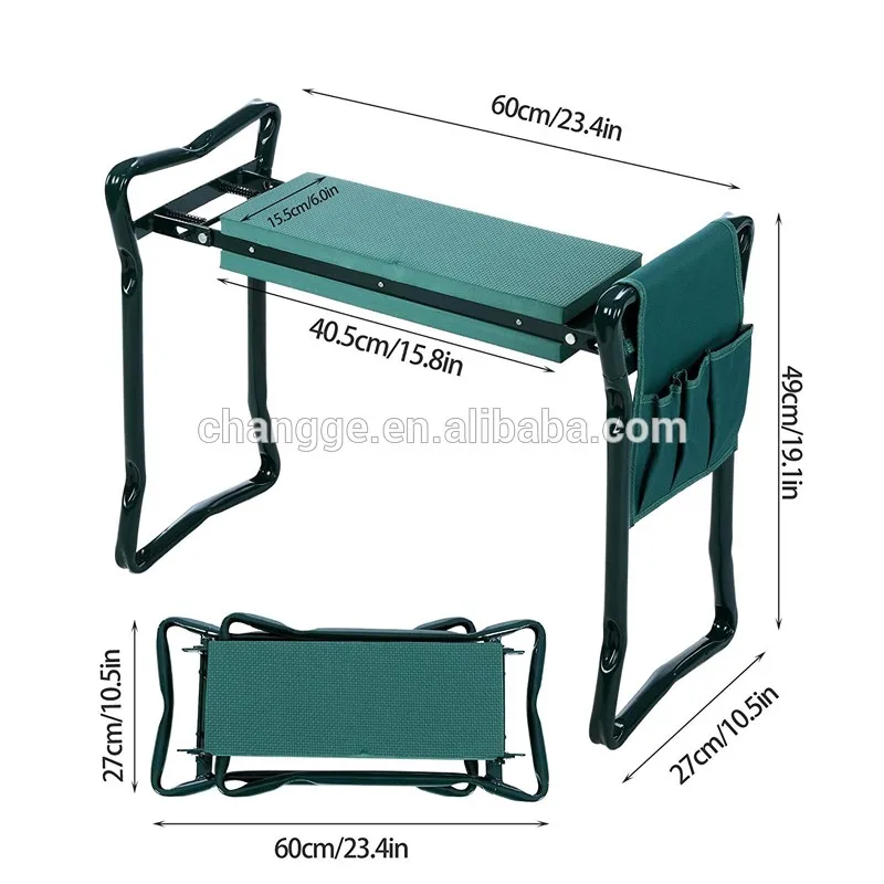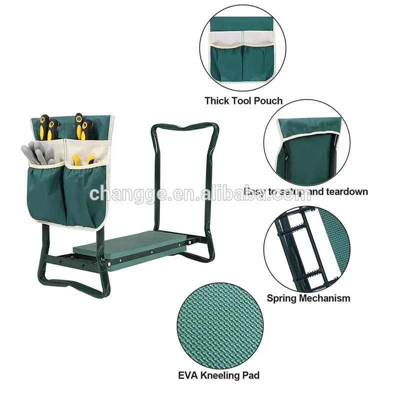 Garden kneeler bench is a great addition to your garden. It is sturdy and comfortable both for sitting or kneeling helping to reduce your aches and pains caused by stooping and kneeling. It also helps keep your clothes away from dirt and grass stains. Both sides of the seat are lined with thick Eva foam pads so your knees have a soft place to rest and your backside has a soft place for sitting. Specifications: - Material: Garden kneeler & seat: Steel Tubing, EVA Foam and Plastic Tool Pouch: 600D Fabric