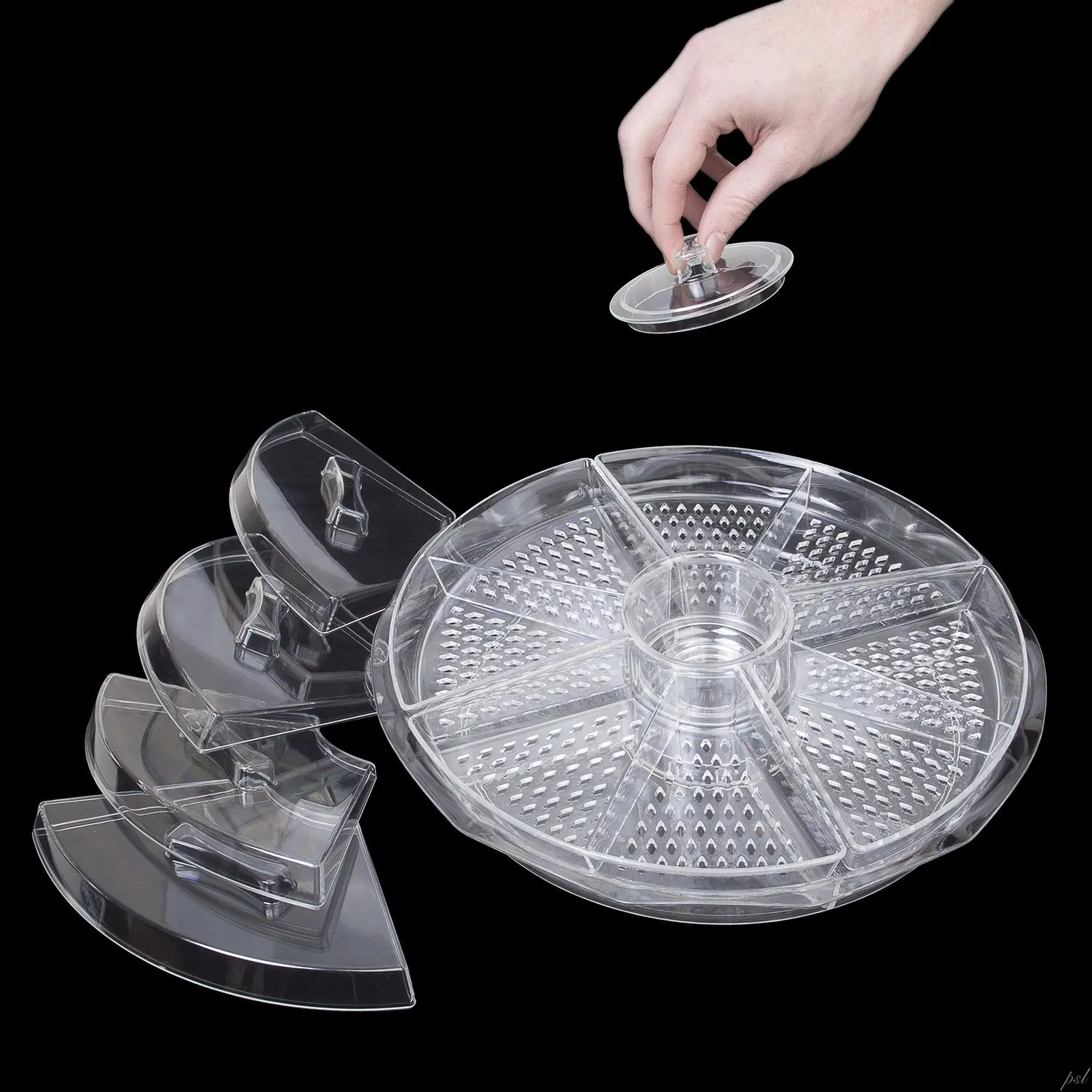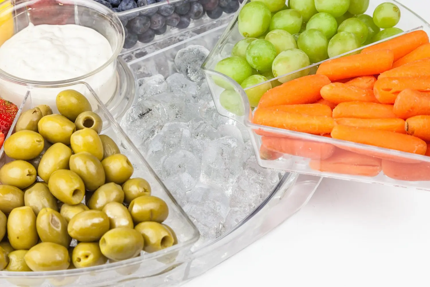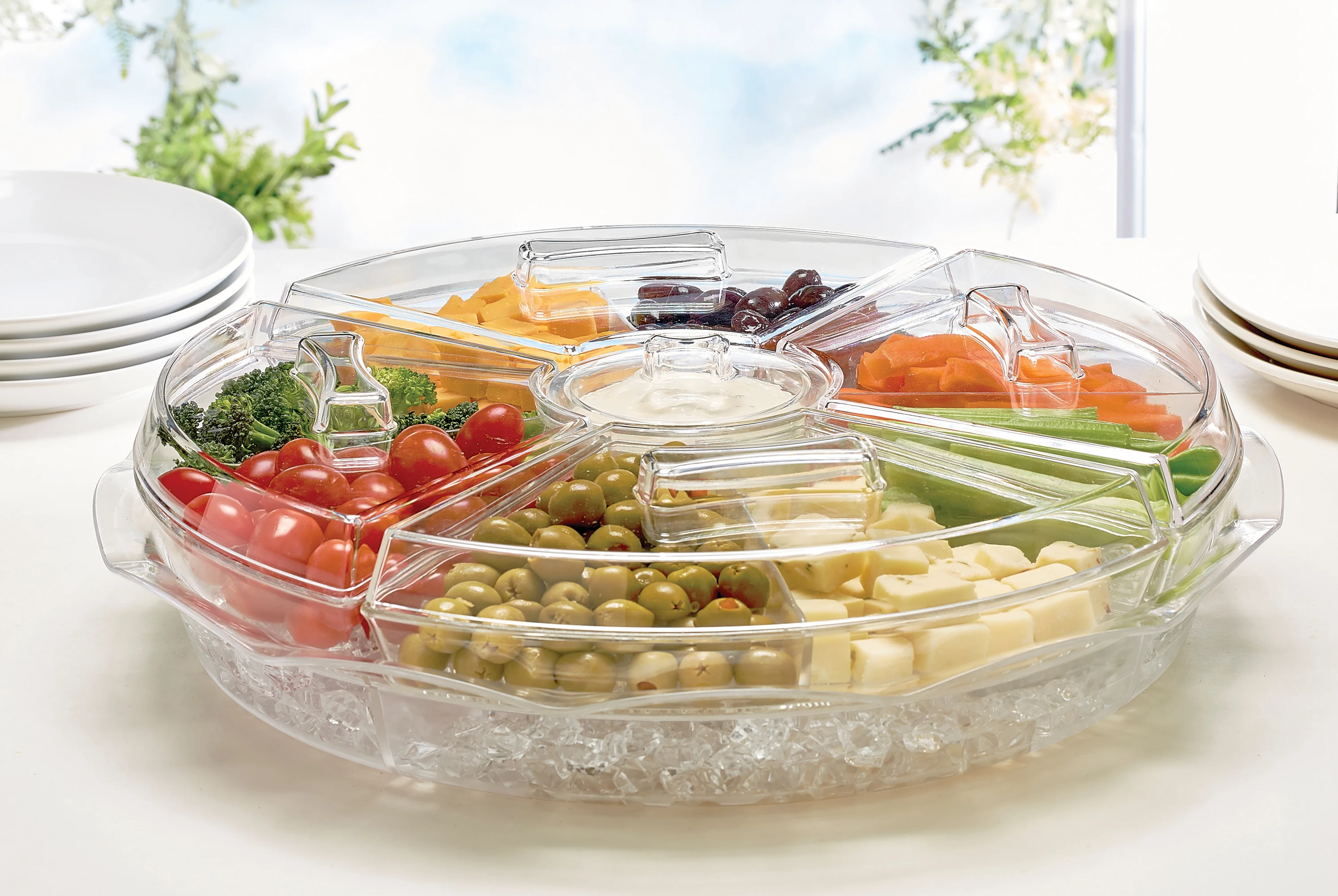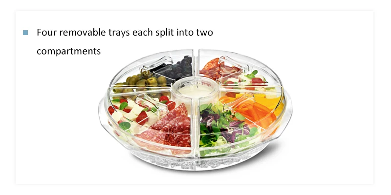 Four removable trays each split into two compartments, along with a central dip tray, all sit atop a deep ice chamber that keeps your snacks fresh and delicious even on hot summer days.