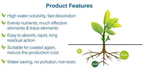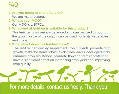 This product which can be used in the whole growth cycle of the crop. This product can supply nutrients needed by the crops quickly, promote crop growth, make its stem stout, developed the root system, enhance crop resistance, promote flower and fruit, increase crop yields and improve crop quality have a significant effect.