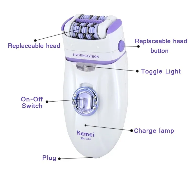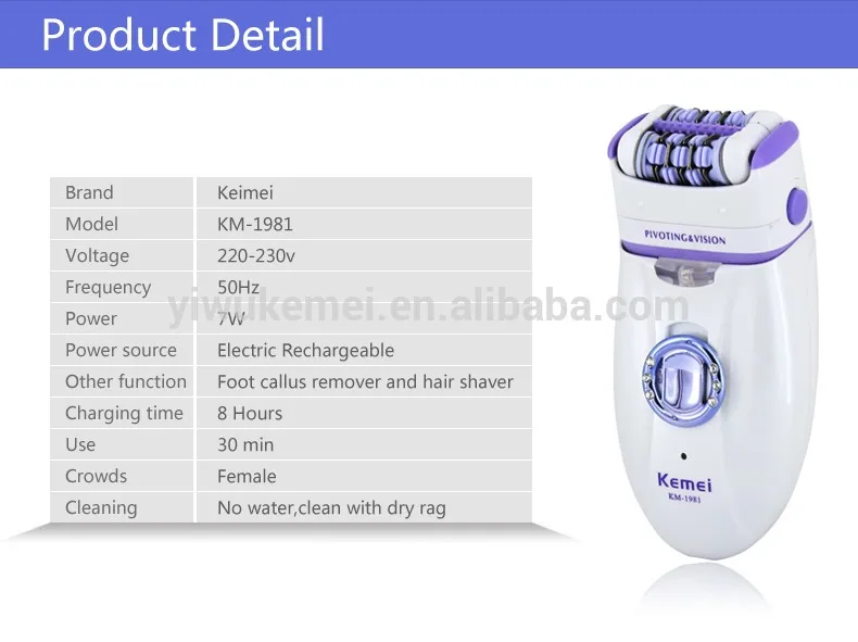 KM-1981 is a professional rechargeable lady shaver set. It perfectly removes your unwanted hair from legs, face, underarms, bikini line and other sensitive areas. The blade adjusts to every curve of your body and skin. The beauty-shape and ergonomic design also provide comfortable using experience.