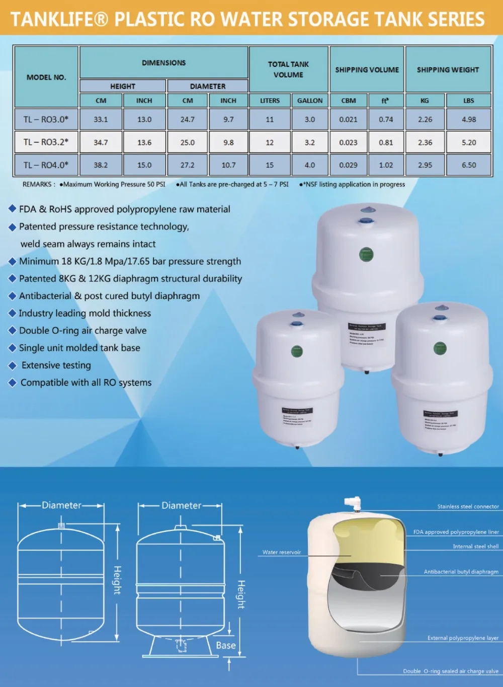 TANKLIFE Reverse Osmosis Tanks are manufactured with the highest rated FDA approved materials and most advanced technologies available. TANKLIFE tanks are the global pioneer in introducing RO tanks with antibacterial butyl diaphragm properties. On top of that, our dust free operated workshop and post curing technologies ensure that any harmful materials are removed from every single diaphragm used in our tanks. This means if you choose TANKLIFE, you choose the most chemical free and bacteria free RO tanks on the market today.