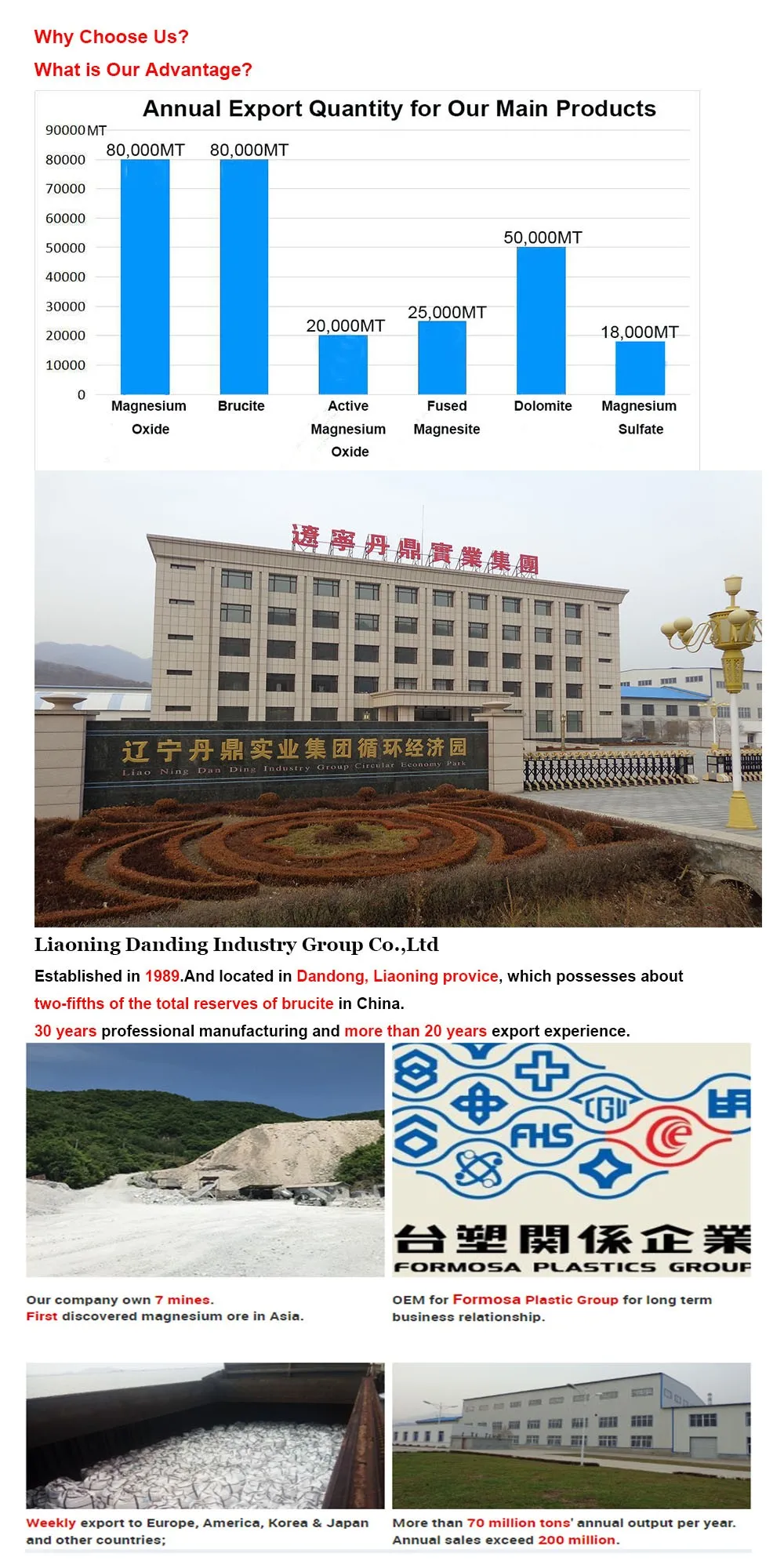 A:First please provide exact contents (such as MgO, CaO...), particle size, your usage information and also the exact quantity, then we can provide you our best quotation ASAP.