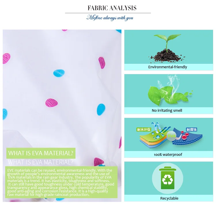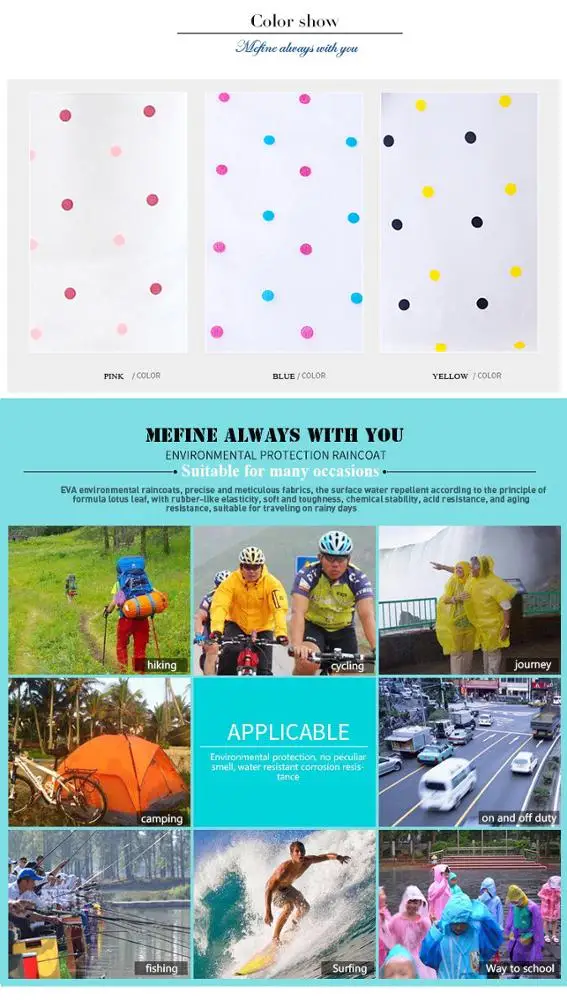 Name : | REUSEABLE EVA Raincoat | Size of Ctn : | 62*42*44 cm |